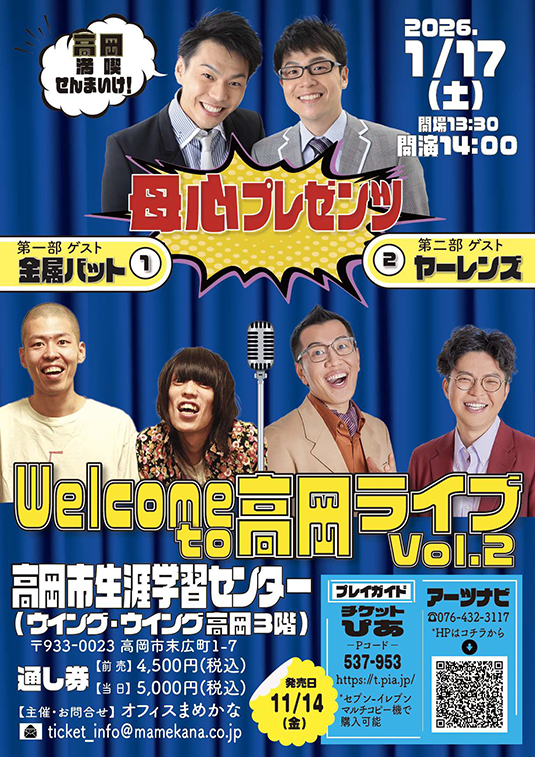 11/14(金)チケット発売!! 母心プレゼンツ 2026年1月17日(土) 高岡市生涯学習センター 【出 演】 【プレイガイド】 |